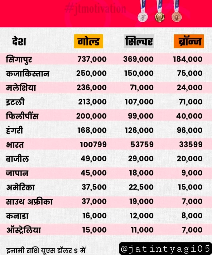 जैसे भारत के लिए अभी मीराबाई चानू ने सिल्वर मेडल जीता है। भारतीय ओलंपिक कमेटी ( IOC) उन्हें 40 लाख रुपये देगी। इसके अलावा रेलवे ने उन्हें 2 करोड़ और मणिपुर सरकार ने एक करोड़ रुपये देने का ऐलान किया है। यानी मीराबाई चानू को अबतक 3 करोड़ 40 लाख रुपये का इनाम मिला है. इस रकम को डॉलर में तब्दील कर दें तो यह राशि करीब 457206 डॉलर होगी।