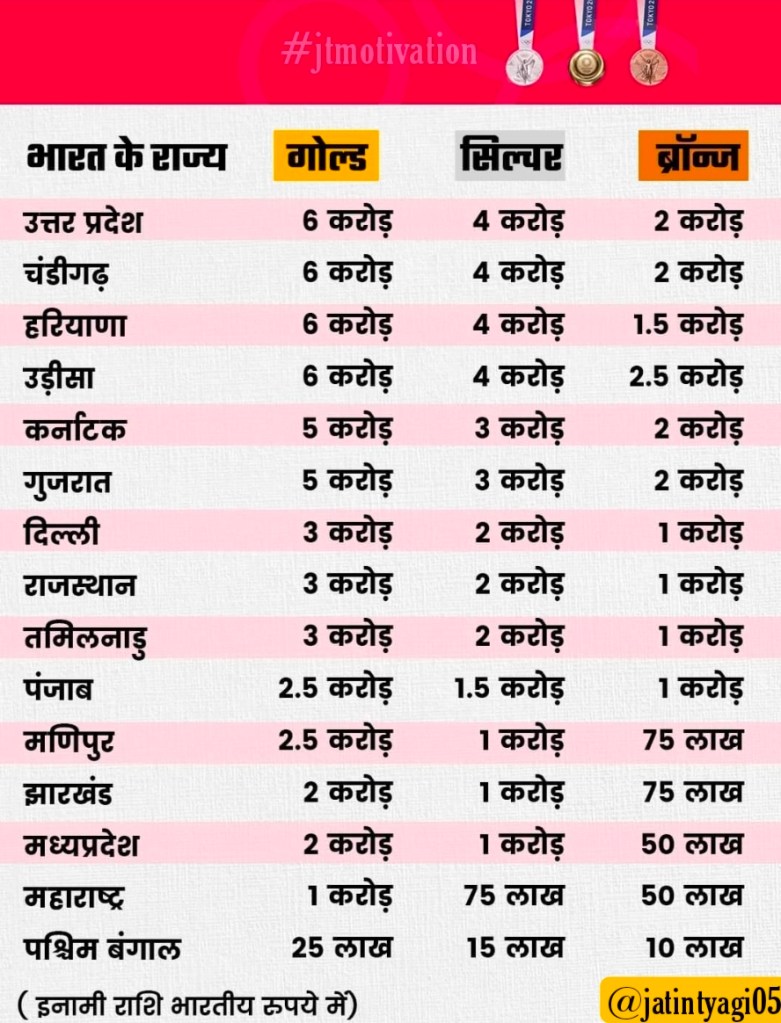 उत्तरप्रदेश, हरियाणा, चंडीगढ़ प्रशासन और उड़ीसा में प्राइज मनी सर्वाधिक है। इन राज्यों में गोल्ड जीतने वालों को 6 करोड़ रुपये और सिल्वर जीतने वालों को 4 करोड़ मिलेंगे। कांस्य जीतने वालों के लिए भी 2 करोड़ रुपये की प्राइज मनी है। ओलंपिक विजेताओं को प्राइज देने में पश्चिम बंगाल ने काफी कंजूसी की है। यहां स्वर्ण पदक जीतने वाले के लिए 25 लाख, चांदी के विजेता को 15 लाख और कांस्य जीतने वाले ओलंपियन को 10 लाख ही मिलेंगे।