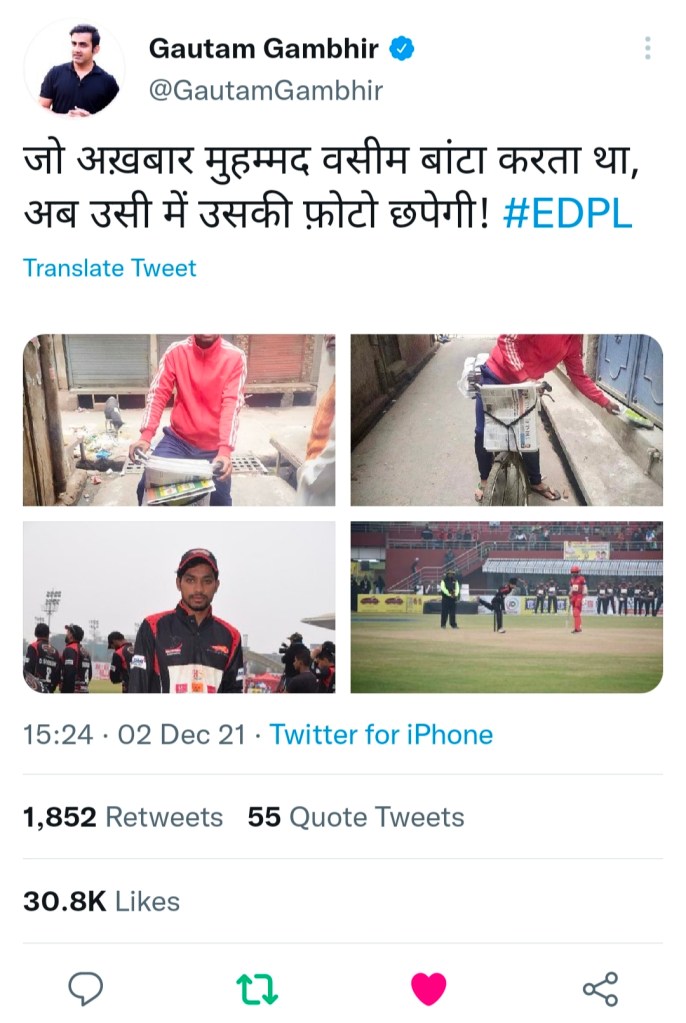 बहुत से लोग नहीं जानते होंगे कि आखिर ये मोहम्मद वसीम है कौन, दरअसल, भारतीय पूर्व दिग्गज क्रिकेटर गौतम गंभीर ने अपने ट्विटर एकाउंट से 4 तस्वीरें शेयर की हैं। ये चारों तस्वीरें अखबार बांटने वाले 19 वर्षीय लड़के मोहम्मद वसीम की हैं. वसीम दिल्ली की गलियों से निकल कर सामने आए क्रिकेट के एक तेज गेंदबाज हैं। बता दें कि पूर्वी दिल्ली में तैयार किए गए यमुना स्पोटर्स कांप्लेक्स में पहली बार दिल्ली ईस्ट दिल्ली प्रीमियर लीग का आयोजन हो रहा है और वसीम का सलेक्शन इसी ईस्ट दिल्ली प्रीमियर लीग के लिए हुआ है।